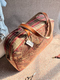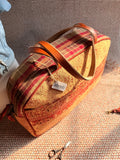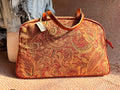 Discover the Patchwork Overnighter, a unique weekender crafted from rich, earth-toned fabrics. The main body features a textured, crinkled gold textile with antique floral prints, beautifully accented by an intricate red paisley border band. Finished with coordinating plaid side panels and a durable cognac faux leather base, this bohemian overnighter bag is perfect for stylish, short trips.