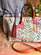 The Wildflower Molly is adorned with beautifully embroidered spring flowers on a heavy duck canvas and is sure to become a new, fresh favorite. Opening with a 12" rectangular snap frame, the Atenti Molly carpet bag shows off a fully lined water resistant taffeta interior. Inside are a zippered pocket and an open divided pocket with a cell phone slot. The Molly has double 22” straps with a 11’ drop and metal feet.