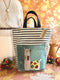 A roomy stand-alone project bag. Top rolls down for easy access. Wide opening and two handles. Fully lined in water our light tan water repellent taffeta. Inside are three pockets. 12" tall x 8" wide x 8" deep