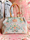 The Atenti Pioneer carpet bag shows off a fully lined water resistant taffeta interior. Inside are a zippered pocket and an open divided pocket with a cell phone slot. The Pioneer has double 21” straps with a 10’ drop and metal feet.