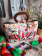 A fun floral cotton print with a Tiger placed perfectly to day hello! This TWA airline inspired bag is built like our overnighter, with double straps, four metal feet, a 24" zippered opening and a full water resistant lining. Inside are a zippered pocket and a divided pocket with a cell phone slot.