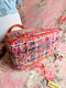 Bringing back our very popular 'Knit'- a multi-color knit print on ultra soft velvet- in a different colorway! This TWA airline inspired bag is built like our overnighter, with double straps, four metal feet, a 28" zippered opening and a full water resistant lining. Inside are a zippered pocket and a divided pocket with a cell phone slot.