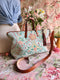 Indulge in luxury and sophistication with Lalique Buddy Bag. Admire the elegant, plush floating flowers in soft shades of pink, inspired by the renowned glass house's delicate sculptures. Crafted with the utmost care and attention to detail, this bag is sure to make a statement wherever you go. This chic sack will be your new BFF! Get a grip on its leather handles, and you can easily adjust the detachable crossbody strap to your comfy fit. It boasts a cream denim lining, a nifty zippered pocket, and a split open pocket with the perfect space for your cell phone. On top of that, it has metal feet and a zippered closure.