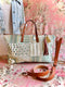 A fun and sophisticated pink and white polkadot cut velvet, giving a Nod to Mod! This chic sack will be your new BFF! Get a grip on its leather handles, and you can easily adjust the detachable crossbody strap to your comfy fit. It boasts a water-repellent taffeta lining, a nifty zippered pocket, and a split open pocket with the perfect space for your cell phone. On top of that, it has metal feet and a zippered closure.