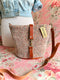 Indulge in the subtle sophistication of the Tally Fifi. Crafted from a richly woven fabric, the intricate interplay of creamy neutrals, warm terracotta hues, and delicate whispers of subtle colors creates heathered effect that catches the eye. The Fifi has a chic silhouette- compact but roomy with handles and a cream denim interior with two interior pockets, and the leather strap has about a 13" drop.