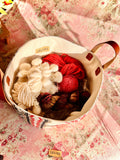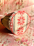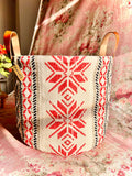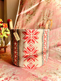 Elevate your home organization with the Snowflake Tall Tucker. Cross stitch style snowflakes and geometric motifs in red, black, white and olive over a full-bodied, natural beige colored jacquard is both functional and fashionable with leather straps. Its sturdy construction ensures it stands tall, making it perfect for storing your favorite items including pillows and throws for the cozy season. Upgrade your home organization with this one-of-a-kind basket! Order yours today and experience the perfect blend of style and function.